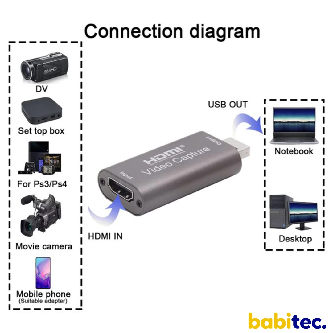 PRINCIPALES CARACTÉRISTIQUES * Supporter la résolution maximale d'entrée 3840 × 2160 @ 60Hz; * Prise en charge de la résolution maximale de sortie 1920 × 1080 @ 30Hz; * Supporte la couleur profonde 8/10/12 bits; * Supporte le câble standard HDMI AWG26: entrée jusqu'à 15 mètres, (résolution 1080P et inférieure); * Prend en charge la plupart des logiciels d'acquisition, tels que VLC, OBS, Amcap, etc; * Prise en charge de Windows, Android et MacOS; * Conforme à la vidéo USB et à la norme UVC; * Conforme à l'audio USB pour la norme UAC; * Sans alimentation externe, compact et portable. VENDU AVEC LE PRODUIT 1 * carte de capture1 * manuel d'utilisation |